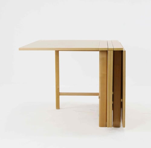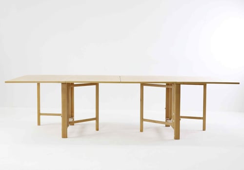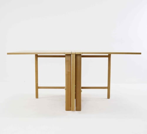 0Bruno Mathsson Maria Flap är en klassisk möbel av mellanårs modern design. Känd för dess mångsidighet, den har en fällbar funktion som gör att den kan omvandlas från en fullmatbord till ett kompakt konsolbord. Tillverkad i bokträ, presenterar det en tilltalande blandning av funktionalitet och estetisk dragningskraft. Dess inneboende minimalism representerar väl principerna för skandinavisk design.